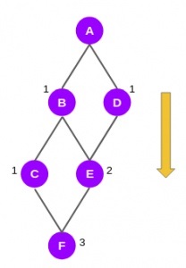 从A到F的最短路径会经过B D C E,最短路径的个数为3:,最终我们可以得到A到其他节点的最短路径个数如下图: